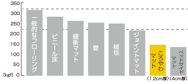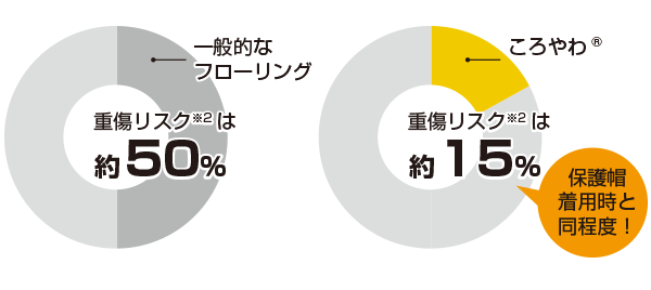 ころやわは、歩いている時は硬く転びにくく、転んだときには床面がへこみ、高い衝撃吸収性を発揮する床&マットです。 歩行時の安定性にも優れ、車椅子や電動ベッドも使える※ため、衝撃吸収マットのように出し入れをする必要もありません。 また、ころやわは骨折リスクを低減し、介護職員様やご家庭で介護をする方の心身の負担を低減いたします。